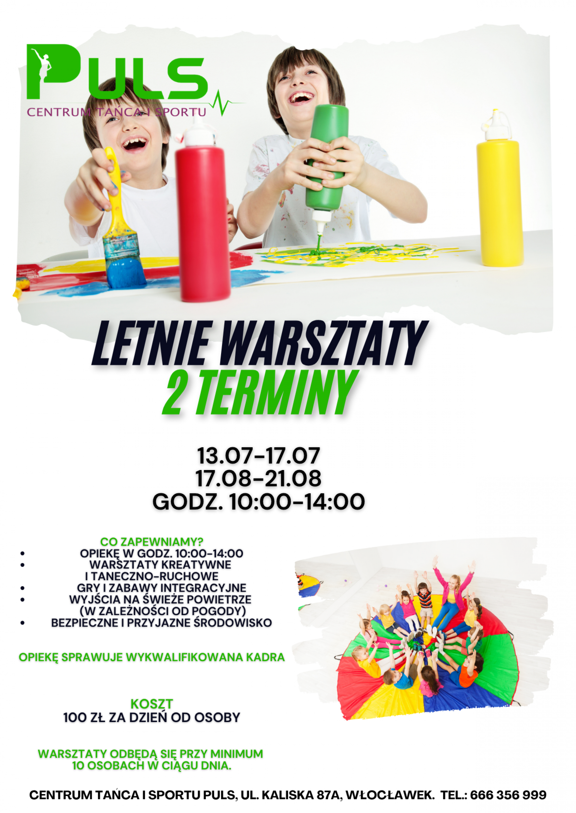 W dniach 13-17.07 oraz 17-21 sierpnia organizujemy warsztaty dzienne dla dzieci w godzinach 10:00–14:00.
